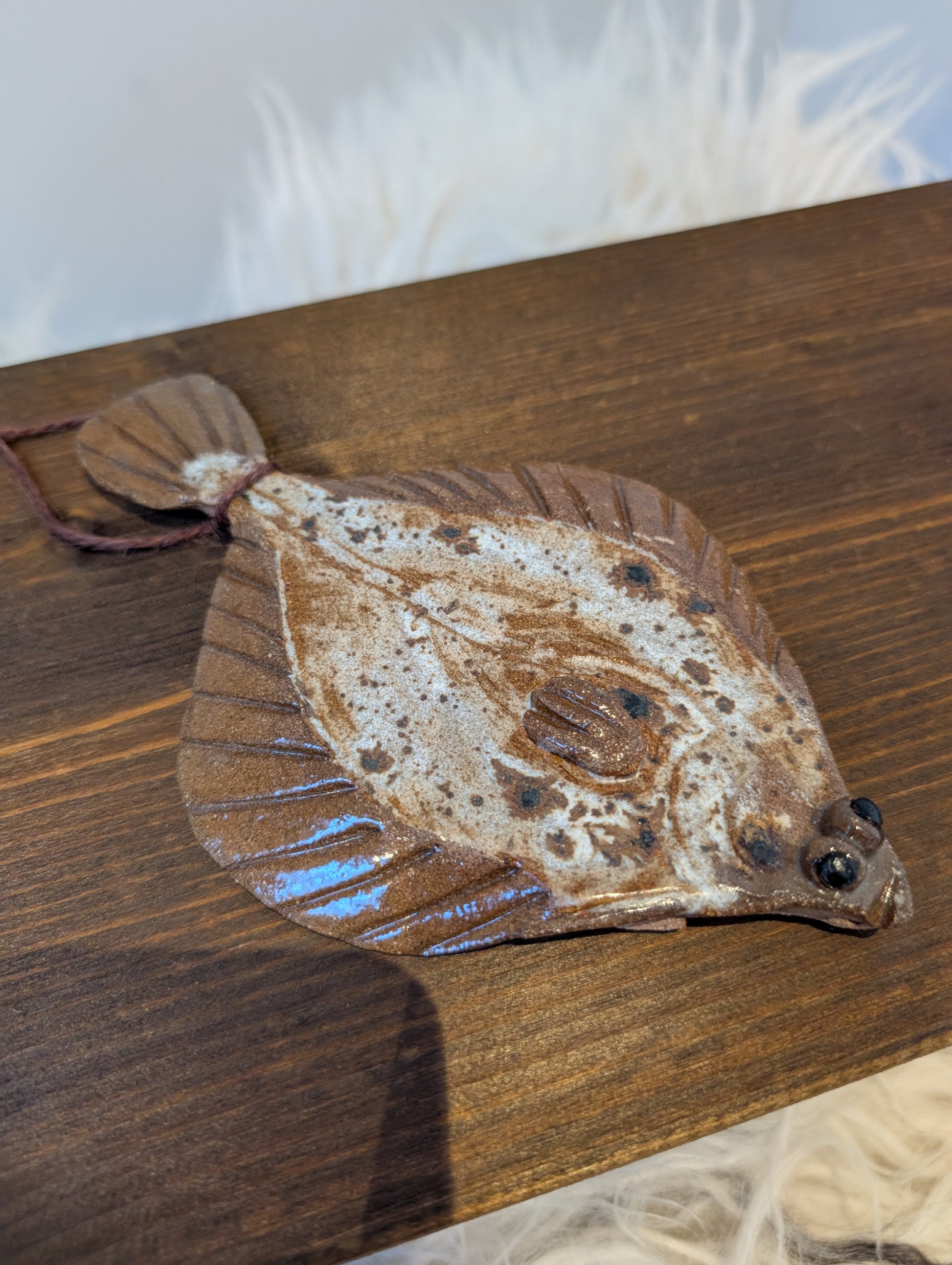 Finurlig stentøjsfisk med smuk plettet glasur. Flot og hyggelig vægdekoration til sommerhus eller i dit køkken.