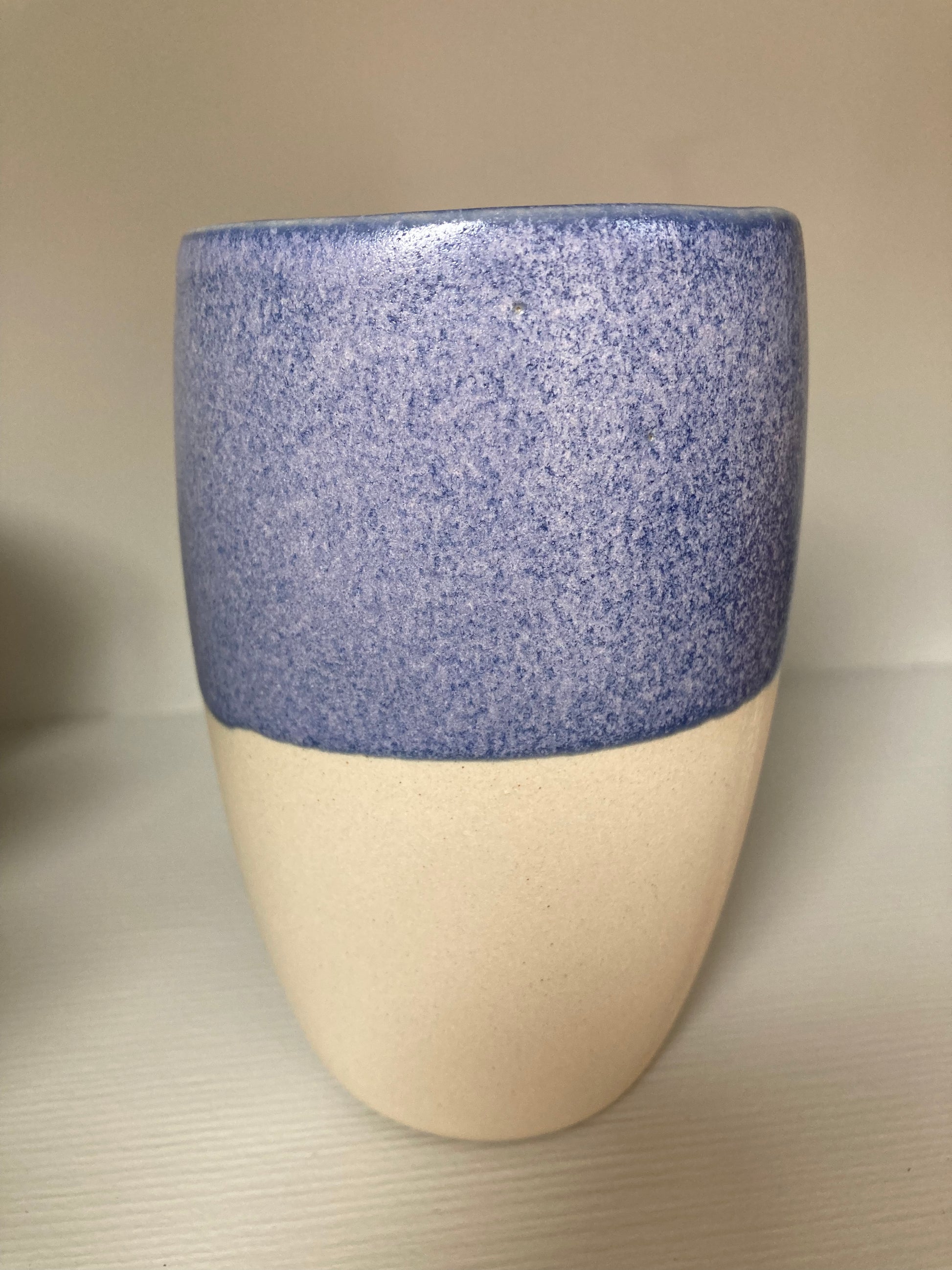 Denne kop har en melleret flot blå glasur og er naturligvis i stentøj.