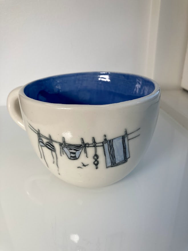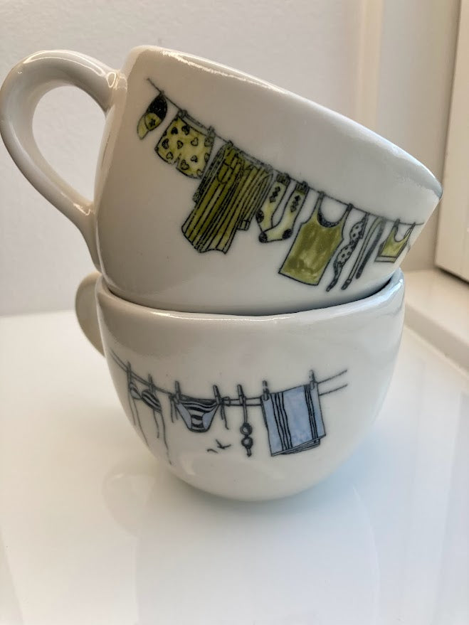 Stentøjskop til te eller varm kakao. Dejlig hyggekopper med vasketøjsnor som motiv.