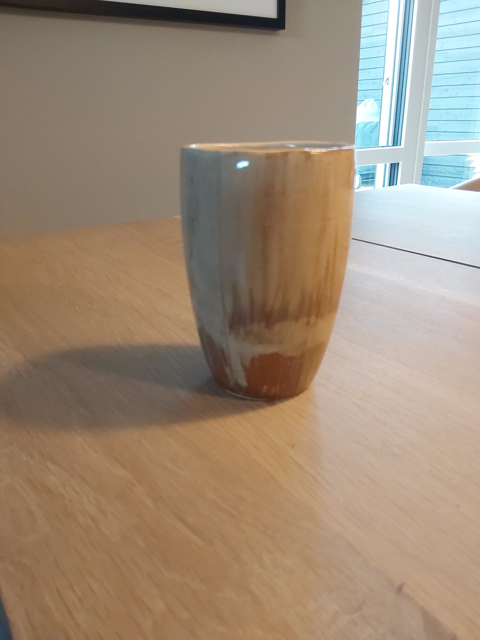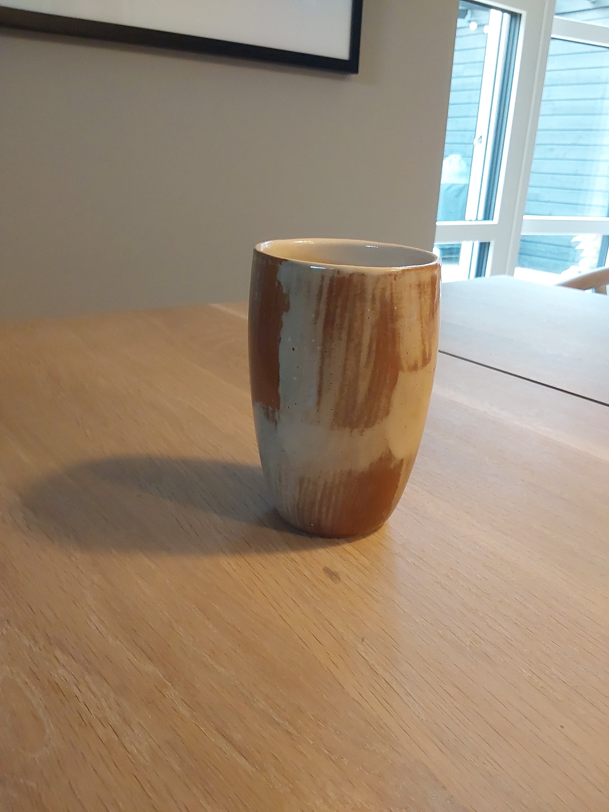 Stor kop uden hank til kaffen. her med en spændende glasur i natur farver fra lys sand til varm brun.