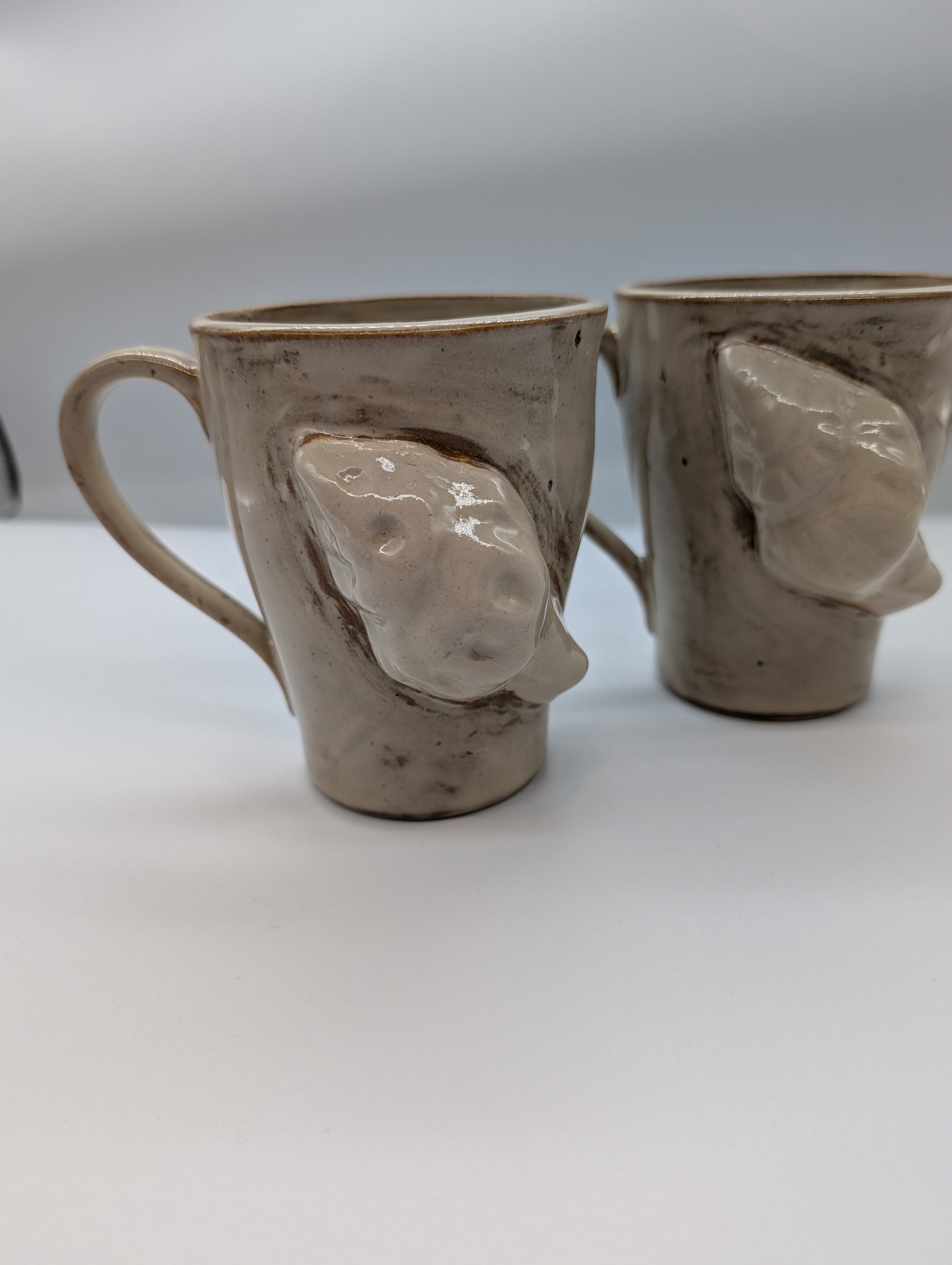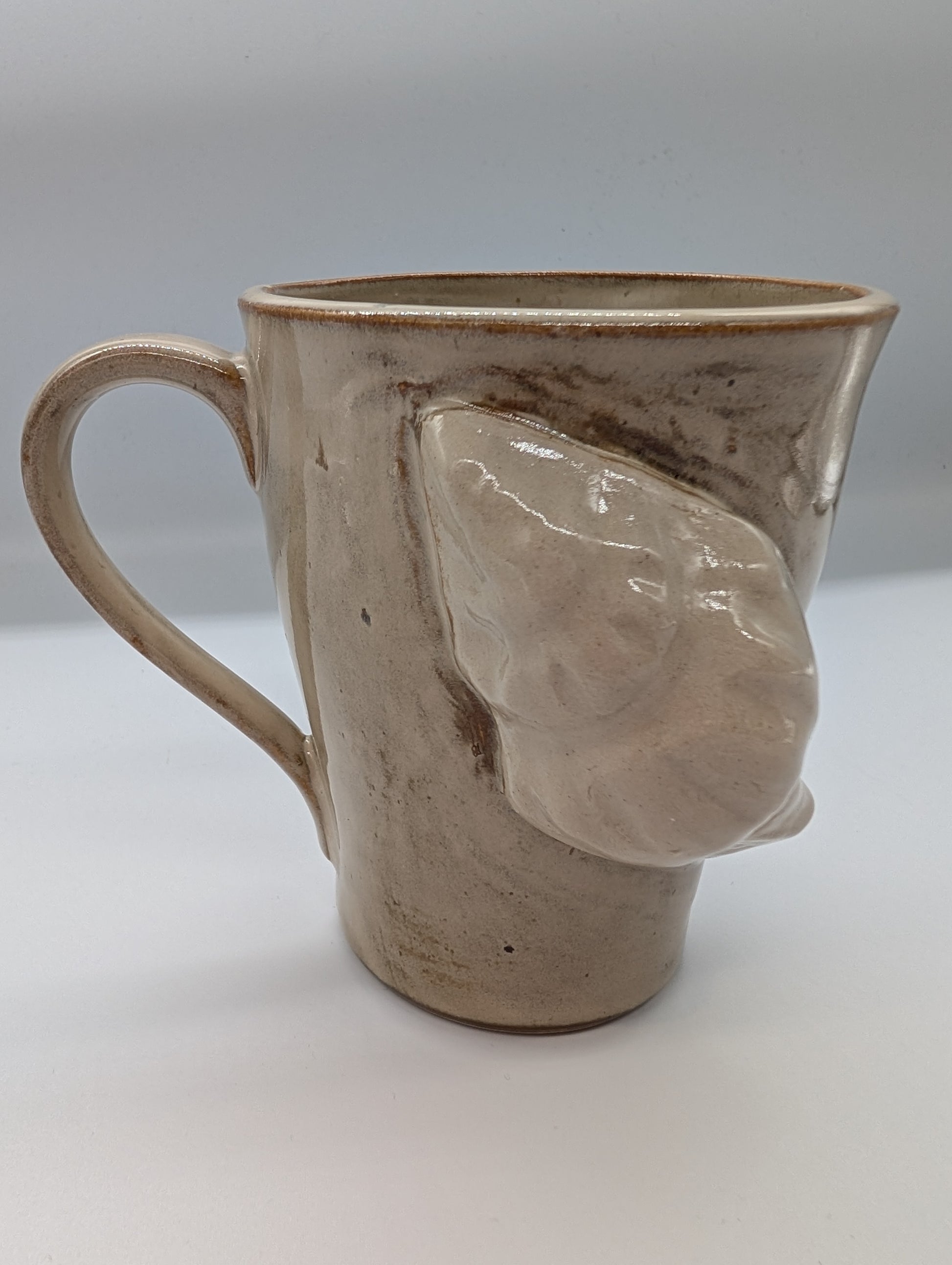 Konkylie kop med hank. Konkylien er lys sandfarvet med perlemor effekt og koppen er beige/ brun med perlemor effekt.