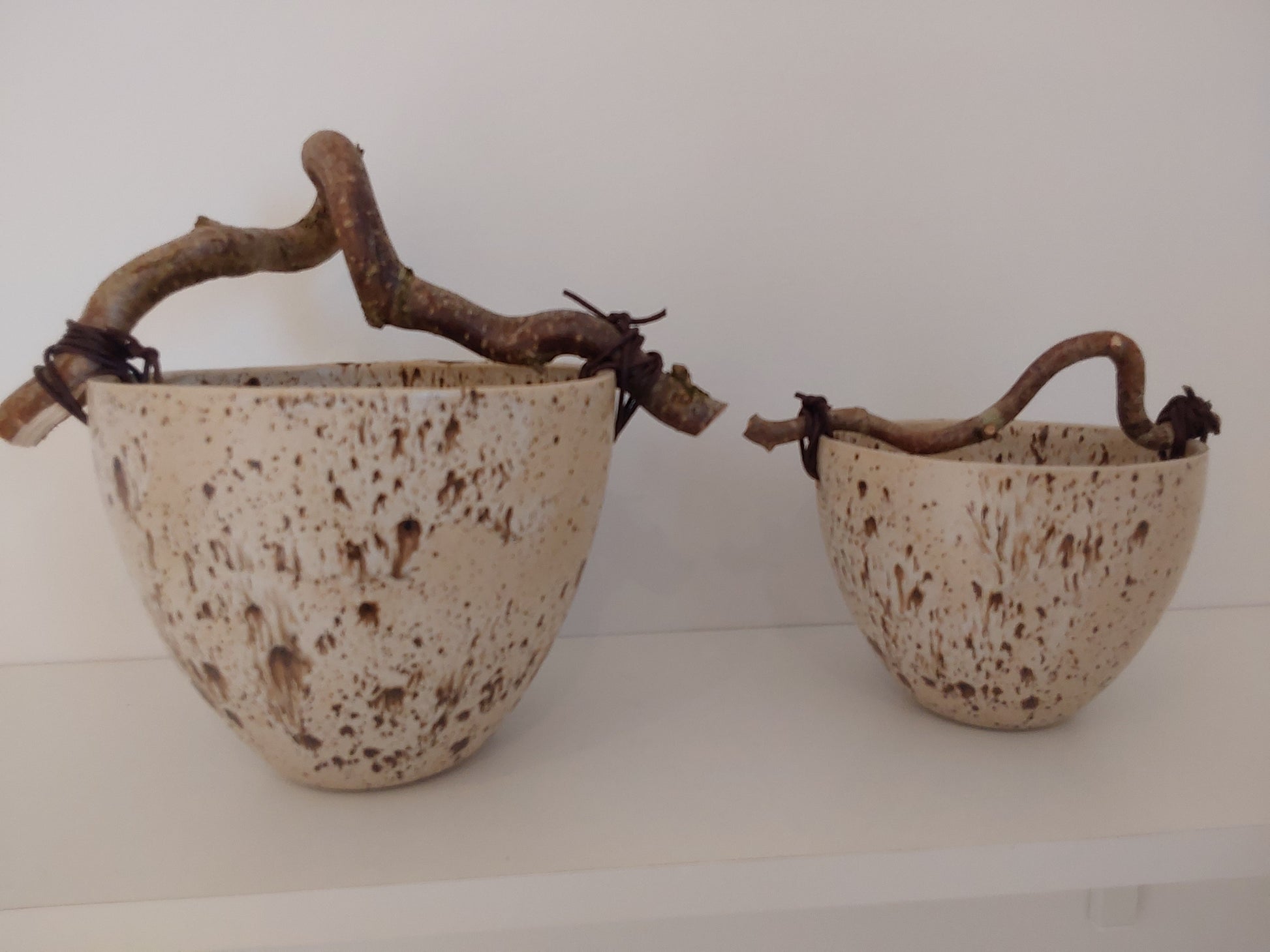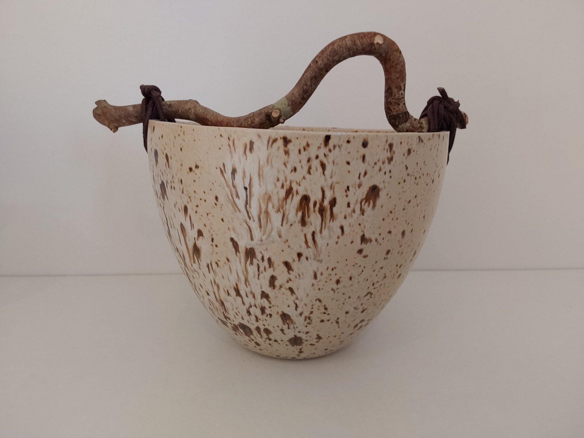 Stentøjsskål med store lavapletter og hank af troldhassel.