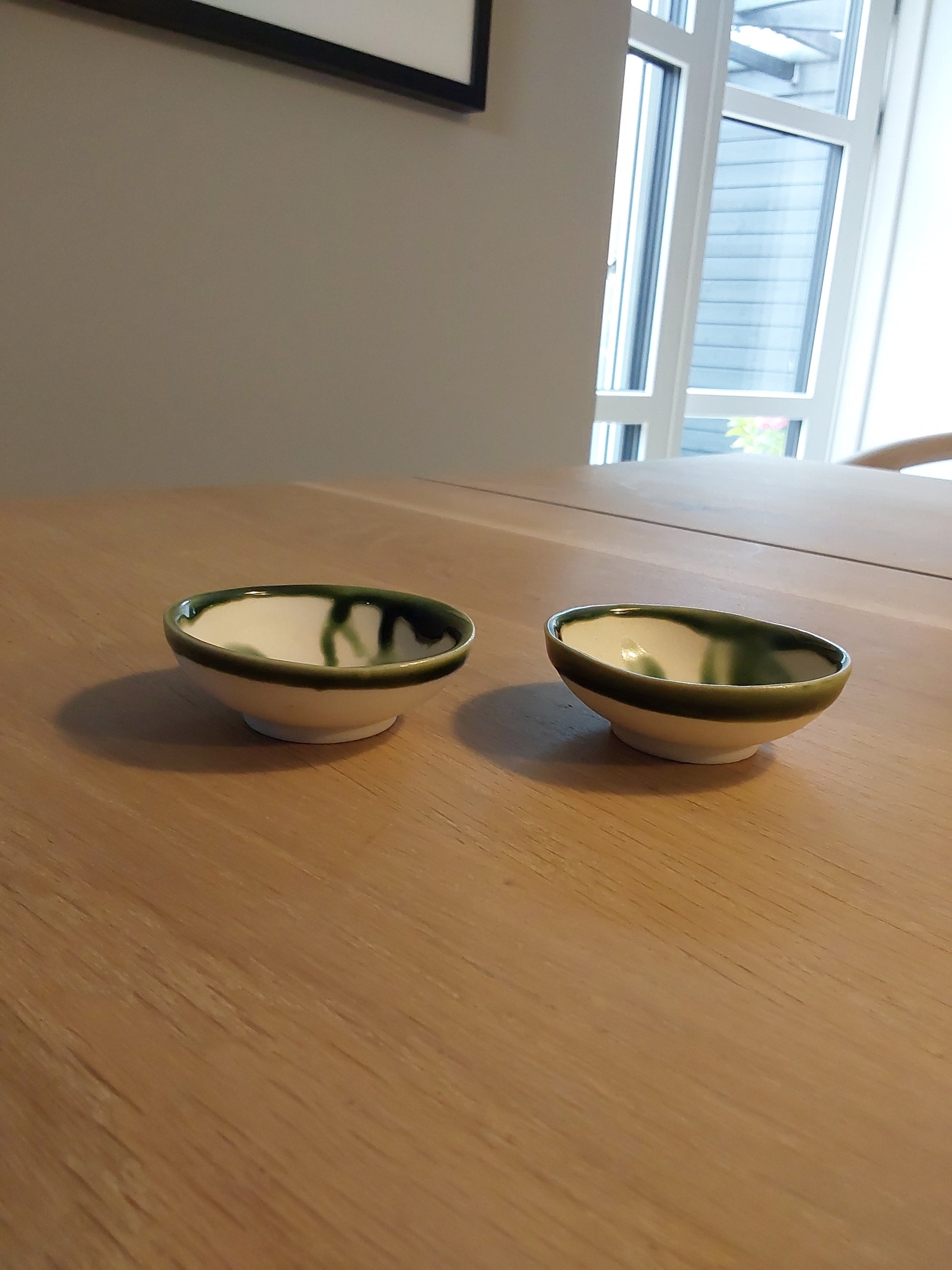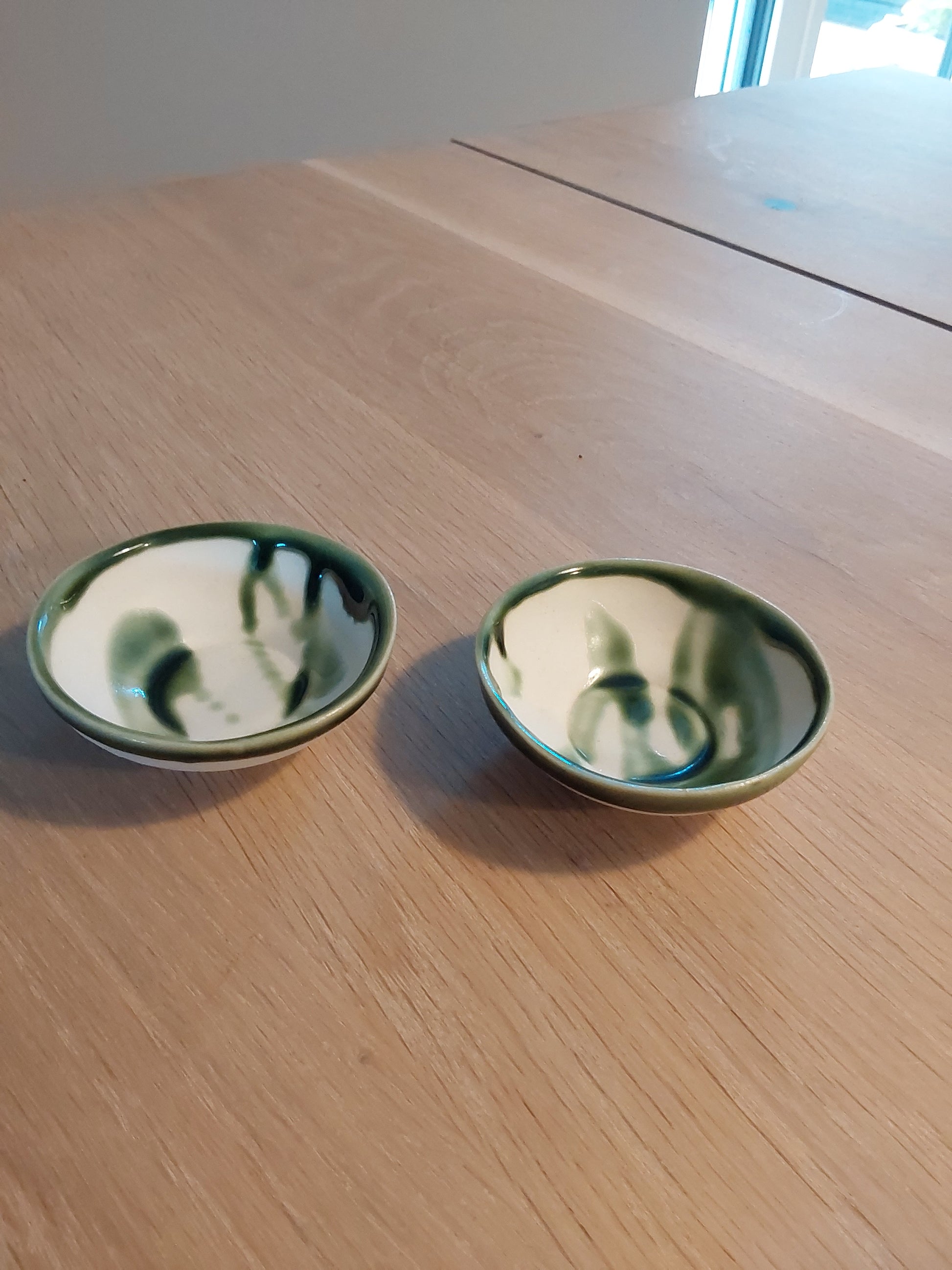 Små porcelænsskåle med flaskegrøn dekor. Passer lige til lidt soja til to.