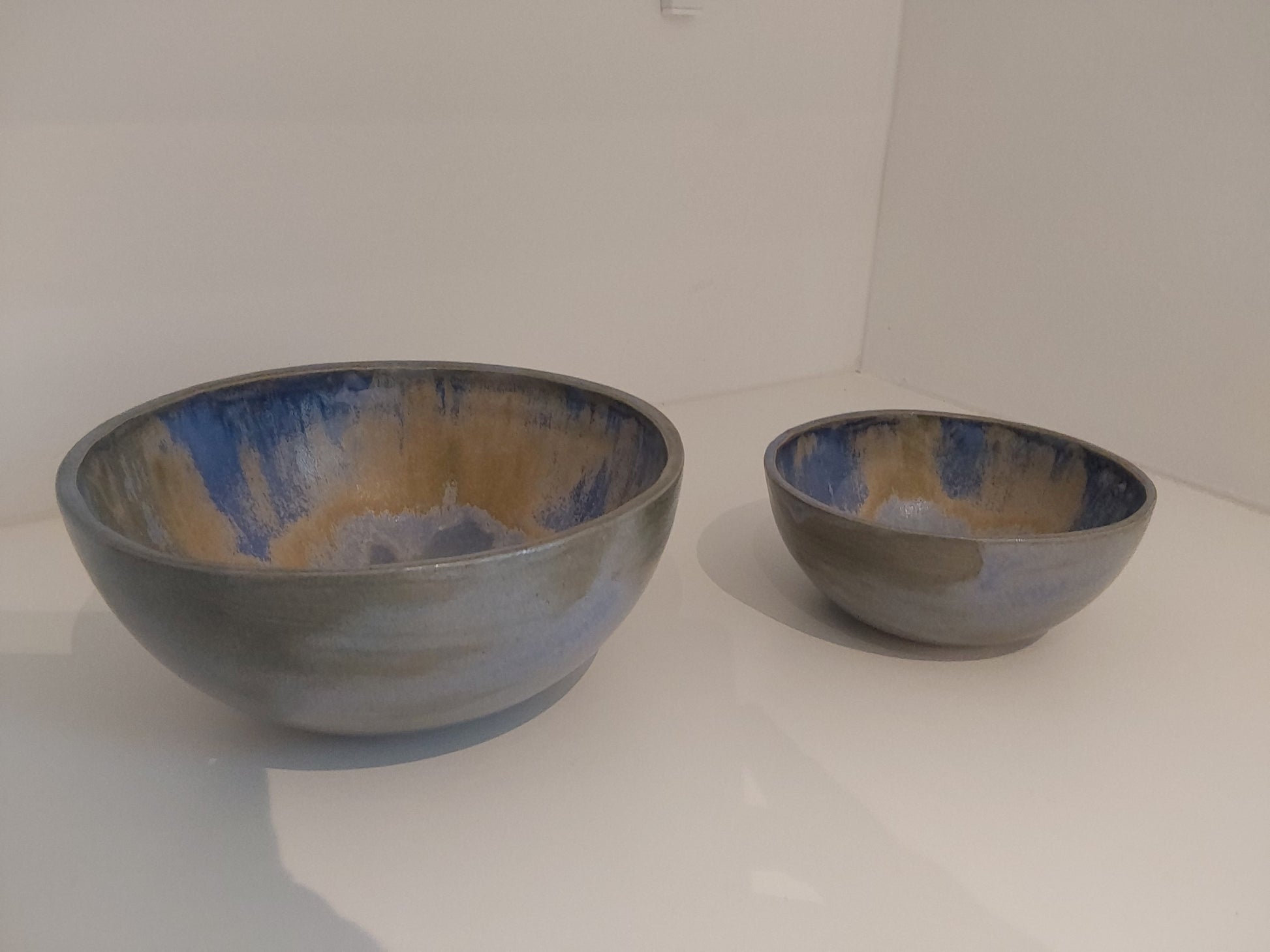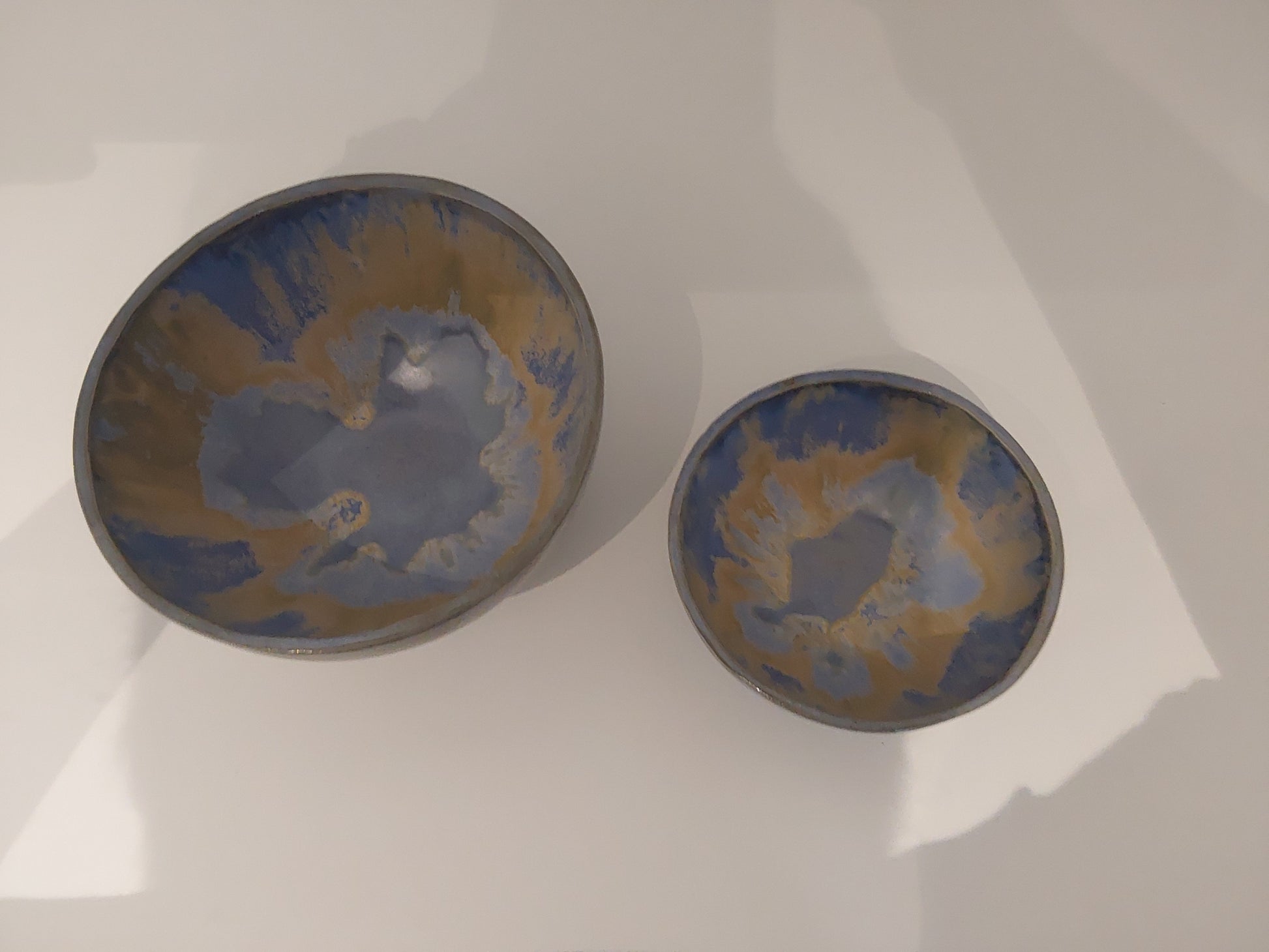 Her ser du et sæt skåle i de skønne naturfarver. Blå som havet og himlen og gyldenbeige som sandet på stranden.